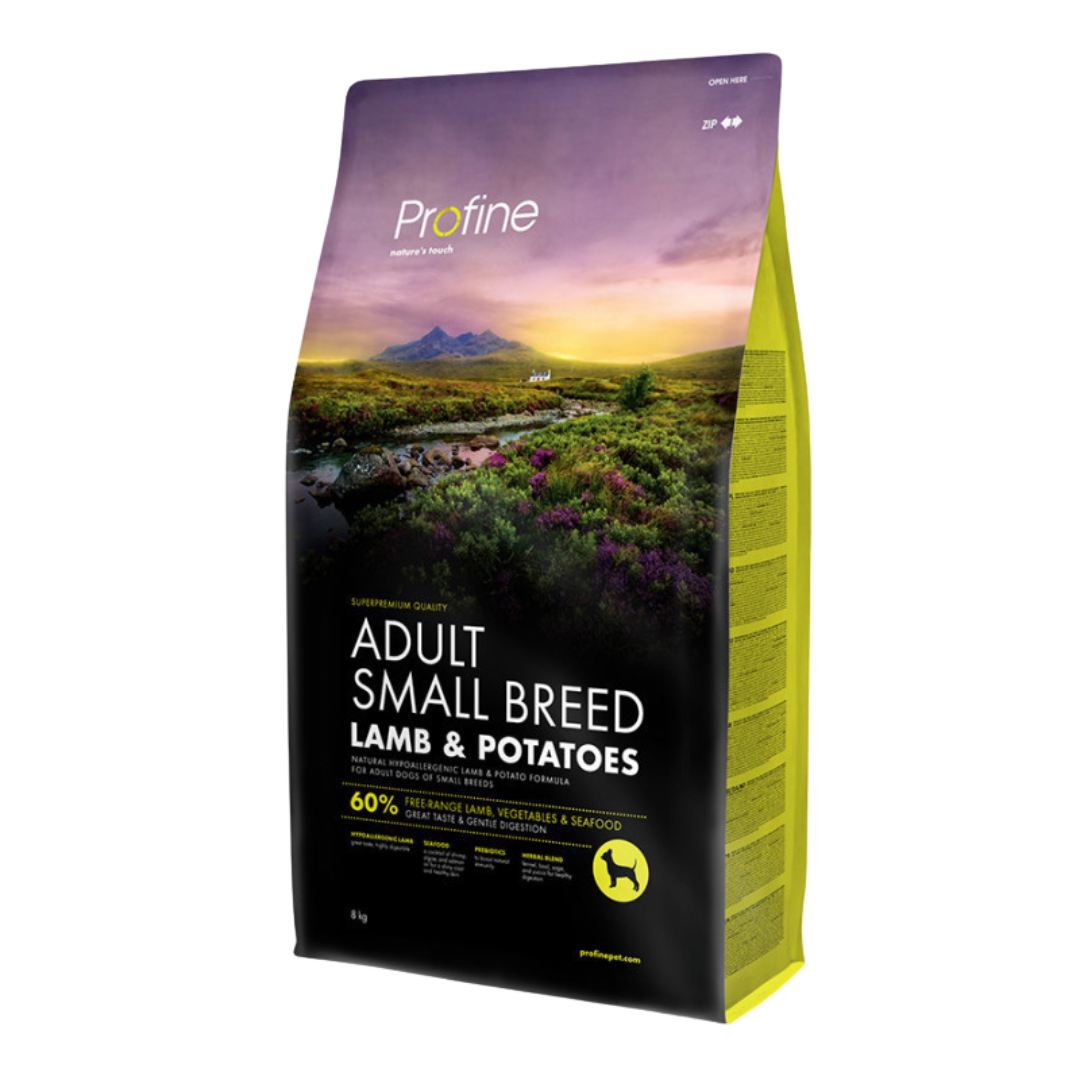Pienso profine completo y equilibrado para perros adultos de razas pequeñas, con ingredientes principales carne de Cordero y patatas, además incluye aceite de salmón.